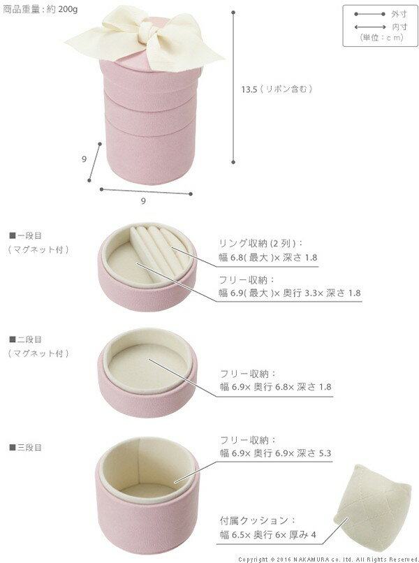サイズ:幅9x奥行9x高さ13.5cm(リボン含む)・約200gカラー:ホワイト・イエロー・コーラルピンク・ピンク・サックスブルー材質:本体(外貼り)-合成皮革(PVC)、内貼り-起毛布、芯材-紙芯完成品株式会社ナカムラ(A0800021)