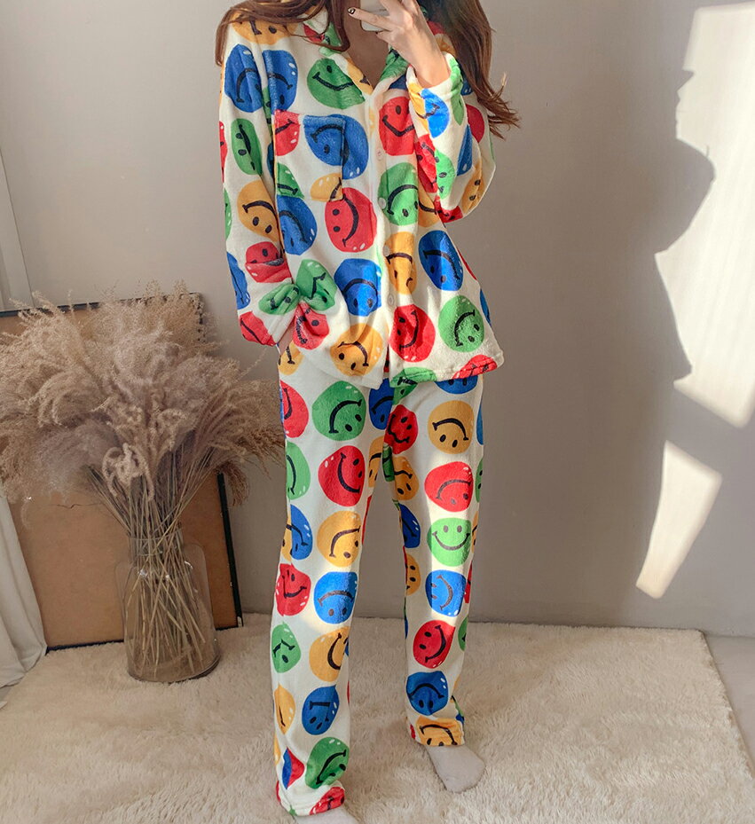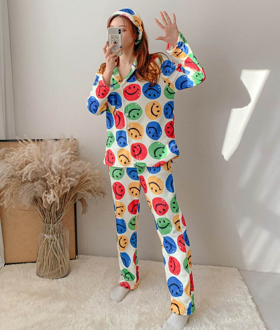 カラフルスマイルパジャマSET・p119263 レディース 【uw】【韓国 ファッション パジャマ パジャマセット 長袖 ボタン 開襟 オープンカラー プリント 総柄 ロング ロングパンツ ゆったり ルーズ ユニーク ルームウェア 部屋着 もふもふ もこもこ カジュアル 秋冬】【STYLE】